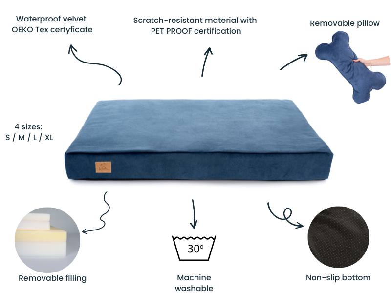 Our bed is made by combining two high-quality mattresses: orthopedic viscoelastic foam that conforms to the shape of the body, and high-density foam as support and insulation from the ground. Viscoelastic foam, also known as memory foam, adjusts to the dog's body shape, providing optimal support during sleep.